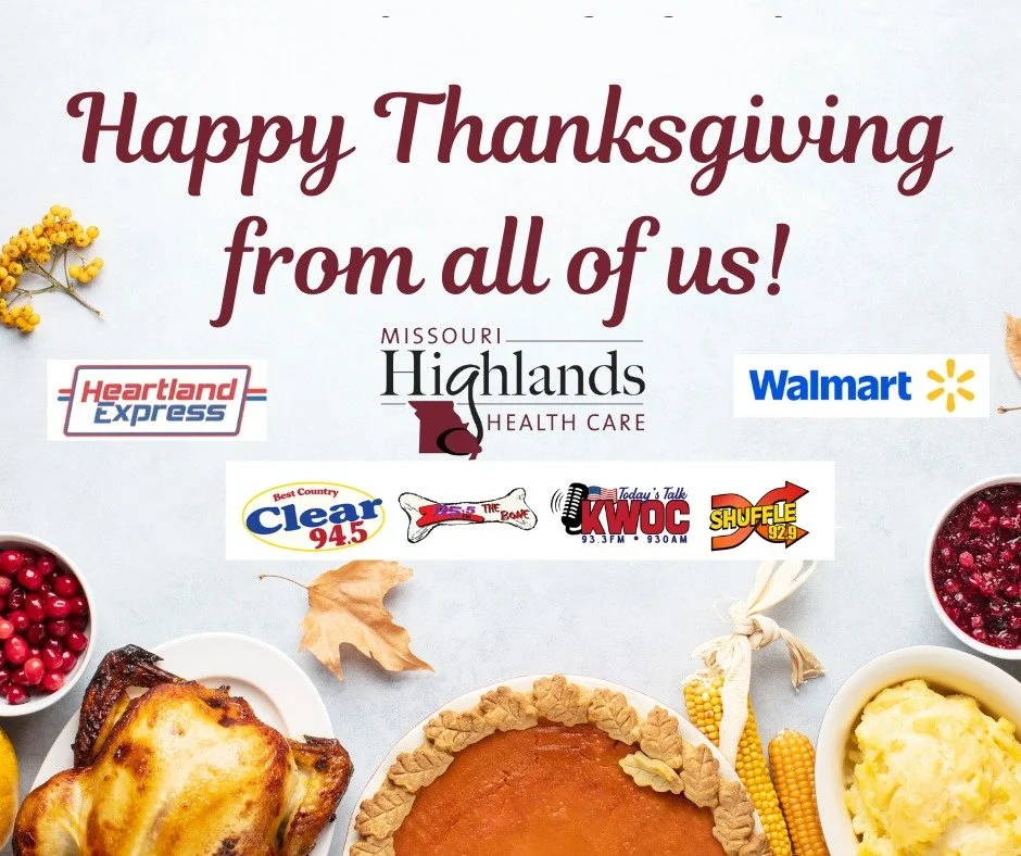 Thank you to Missouri Highlands Health Care , with the help of Heartland Express Market and Wal-Mart in Poplar Bluff, for providing 100 Thanksgiving dinners for families in our listening area